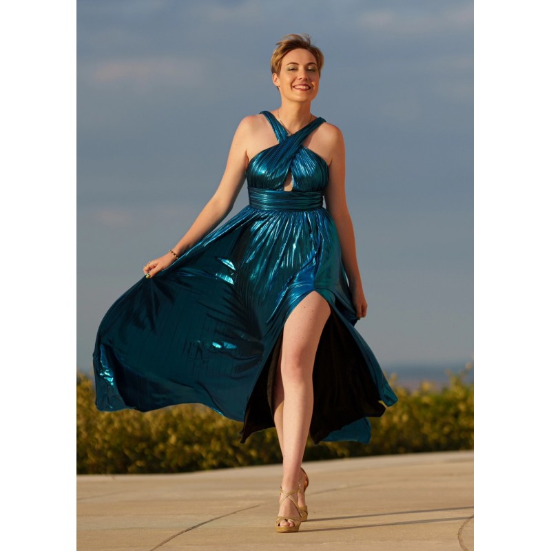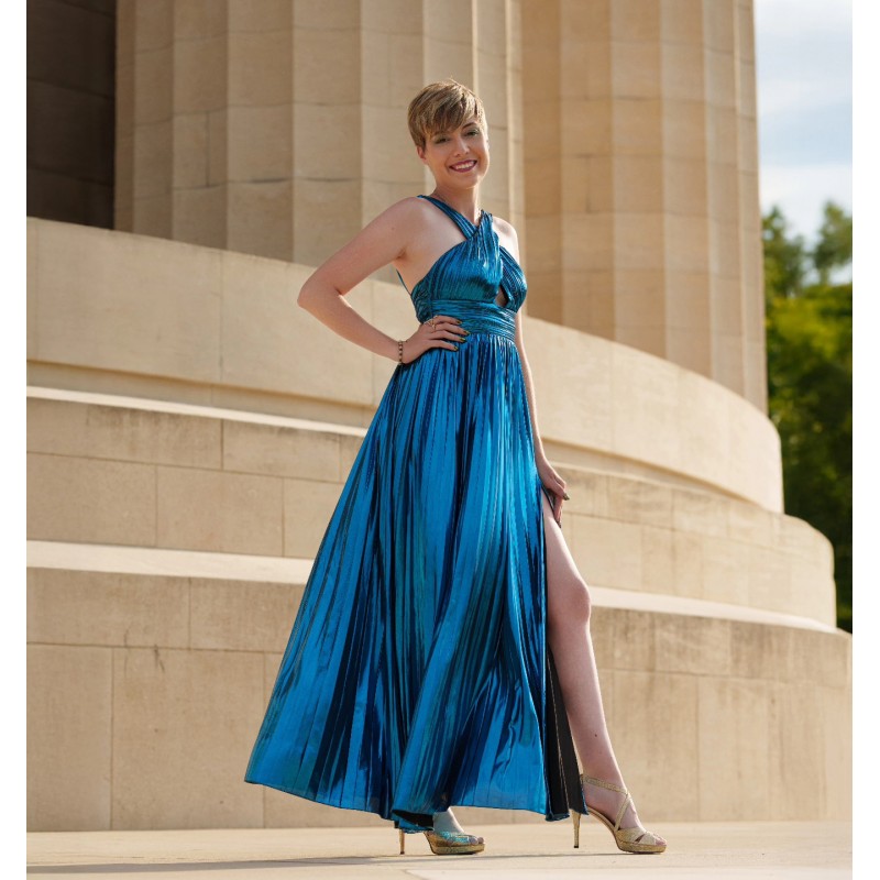 Robe longue plissée, sublimée par un tissus couleur bleu aux reflets changeants