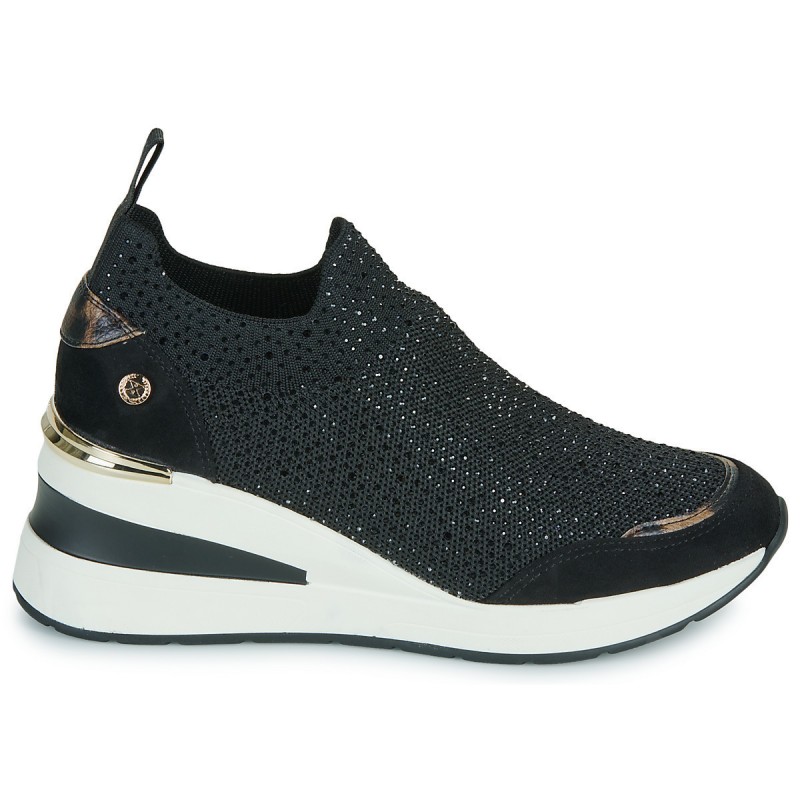 Baskets pour femme Xti. En textile ornées de strass scintillants avec empiècements léopard et finitions dorées. Languette arrière pour un enfilage facile. Modèle avec semelle en caoutchouc antidérapante.
