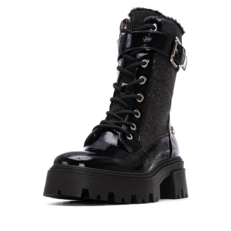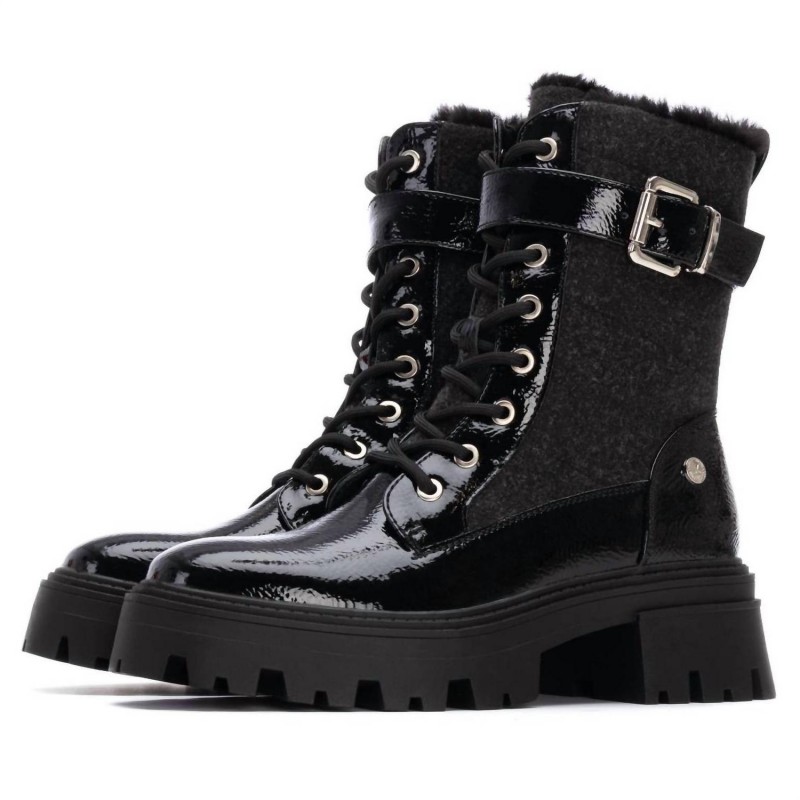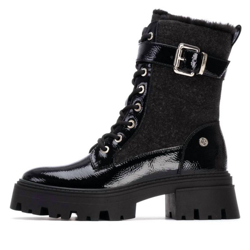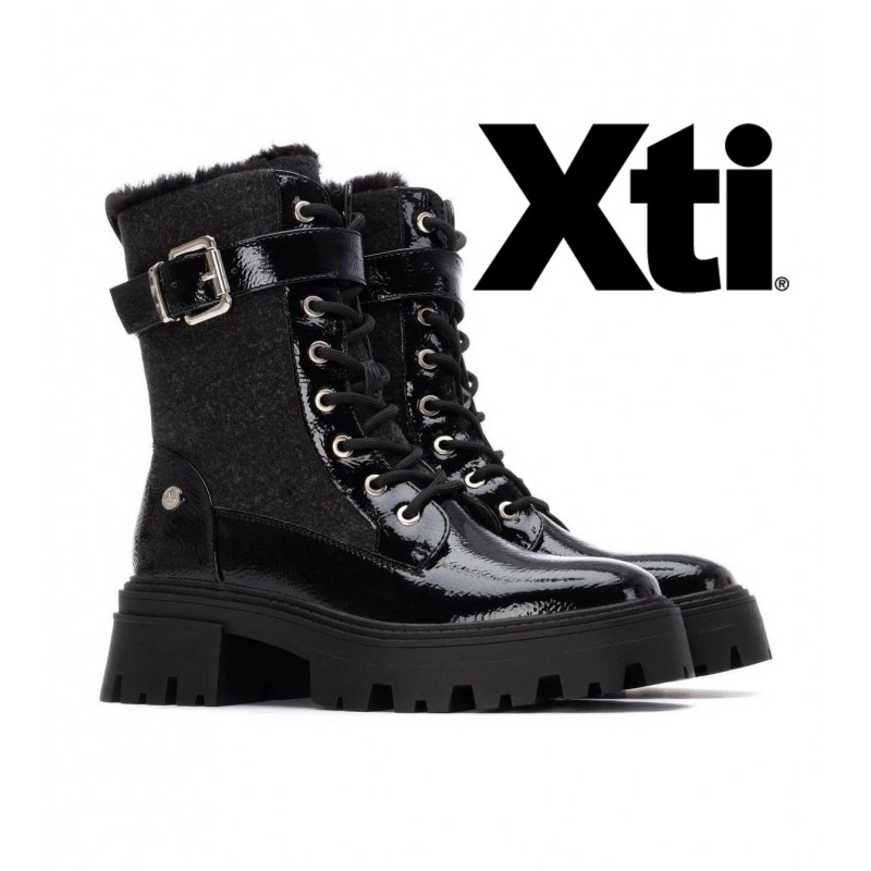 Bottines pour femme de la marque Xti. Confectionnées en verni et textile, elles offrent une finition texturée élégante. Leur semelle large et légèrement épaisse en caoutchouc offre une grande stabilité et un confort de marche optimal, idéal pour les longues journées. Ces bottines arborent une touche de style militaire, avec des détails qui leur confèrent une allure audacieuse et moderne. Leur boucle latérale renforce leur style distinctif et leur confère une touche de caractère. Elles s'associent parfaitement à des looks urbains et saisonniers. Elles sont dotées d'une semelle intérieure amovible à mémoire de forme.