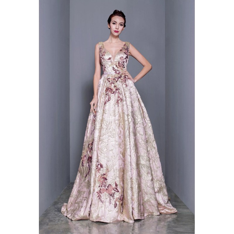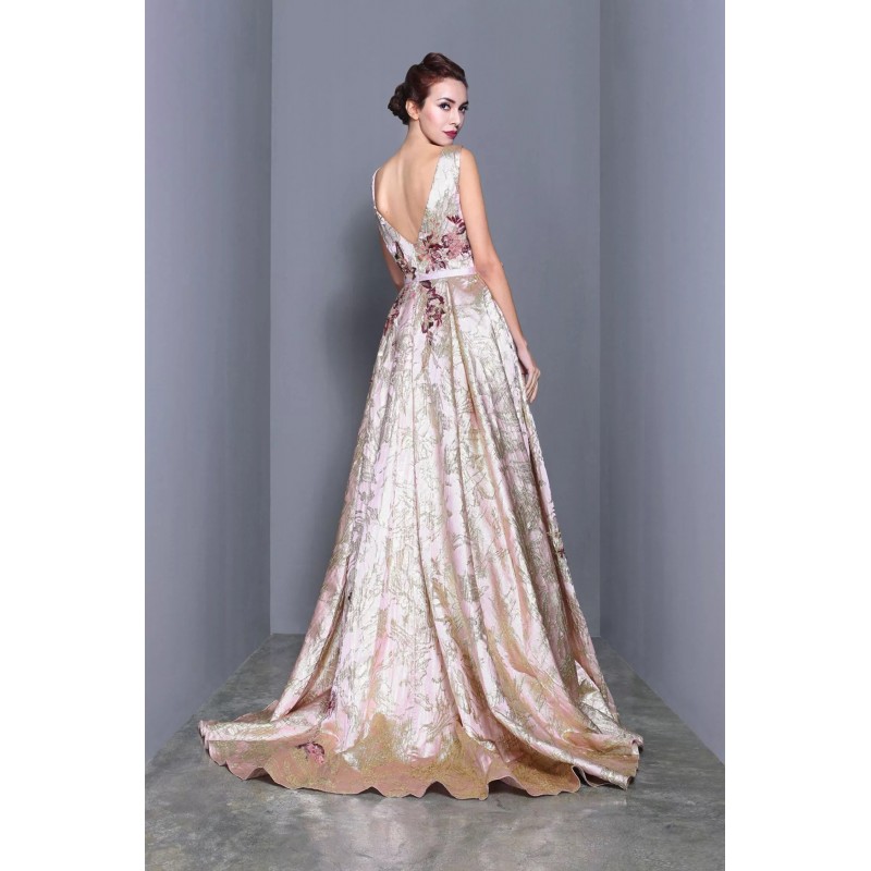 Vous êtes une femme en or… et méritez donc de rayonner dans cette éblouissante robe aux envoûtantes dorures ! Son tissu satiné délicatement rebrodé de motifs à fleurs, et le féérique volume de sa jupe lui donnent une allure divinement romantique… Quant au décolleté en cœur sur le devant, en V dans le dos et la taille soulignée par une fine ceinture, ils apportent une touche sensuelle et sophistiquée.