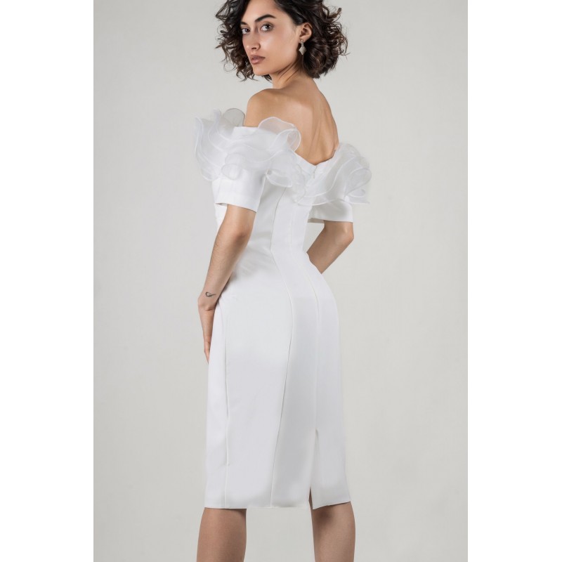 Cette robe épouse les formes à la perfection. Les manches dénudées sont réhaussées par des vagues d'organza.