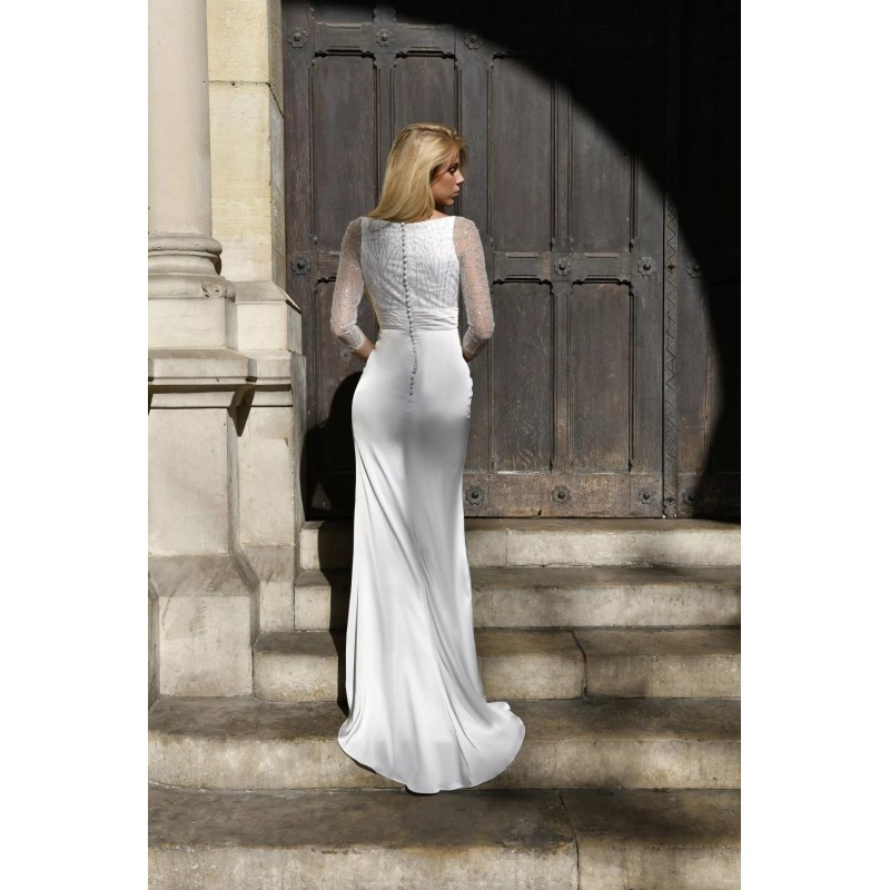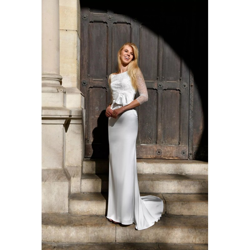 Robe longue manches 3/4 en satin, arborant un bustier brodé avec sequins. La silhouette est soulignée par une bande large avec flot offrant une allure sculptée et élégante. Le tissu doux et lumineux capte la lumière avec raffinement, pour une apparence gracieuse et moderne