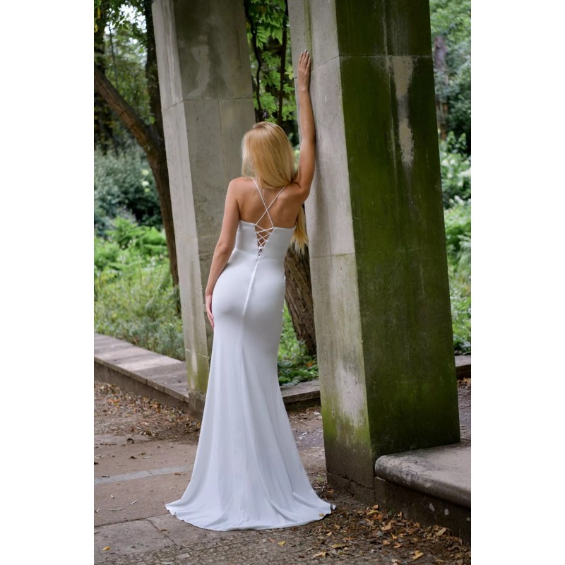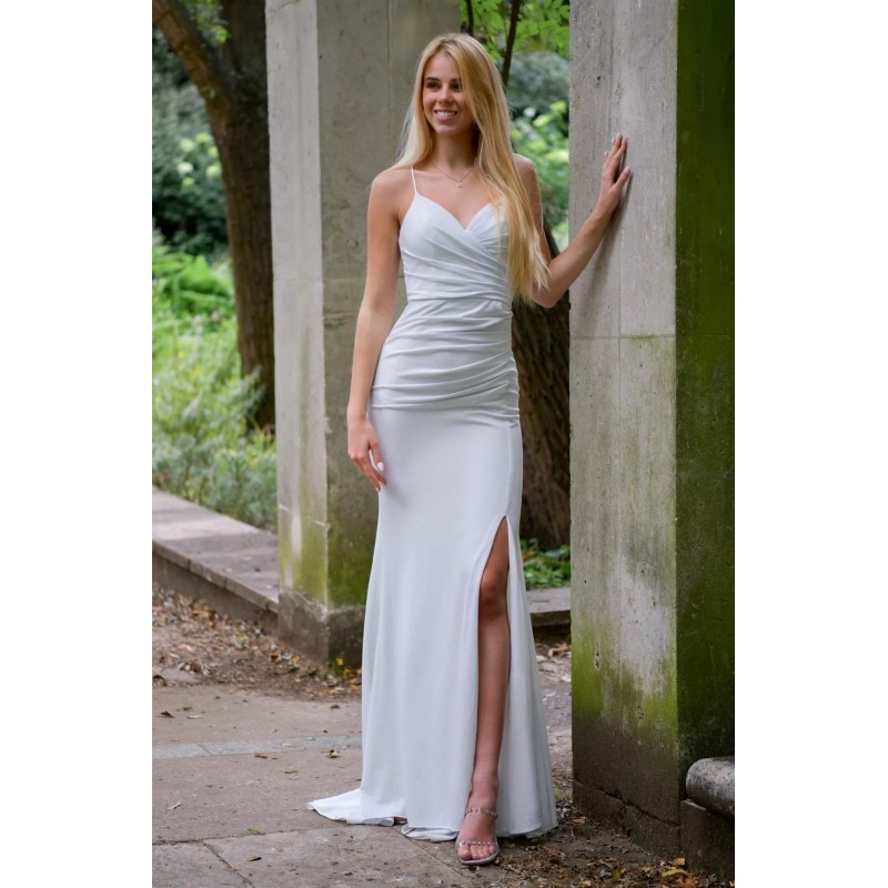 Cette robe gracieuse est dotée d'une fermeture à glissière invisible dans le dos. Les liens au dos assurent un ajustement parfait, tandis que les reflets métalliques de cette robe ajoutent du glamour et du piquant. La silhouette moulante met en valeur vos courbes, tandis que la jupe plancher avec fente haute apporte du glamour à l'ensemble. Le corsage à bretelles spaghetti avec décolleté en V et le dos ouvert et lacé sont sexy.