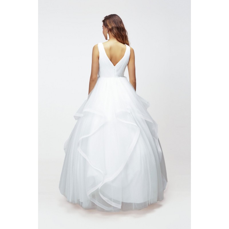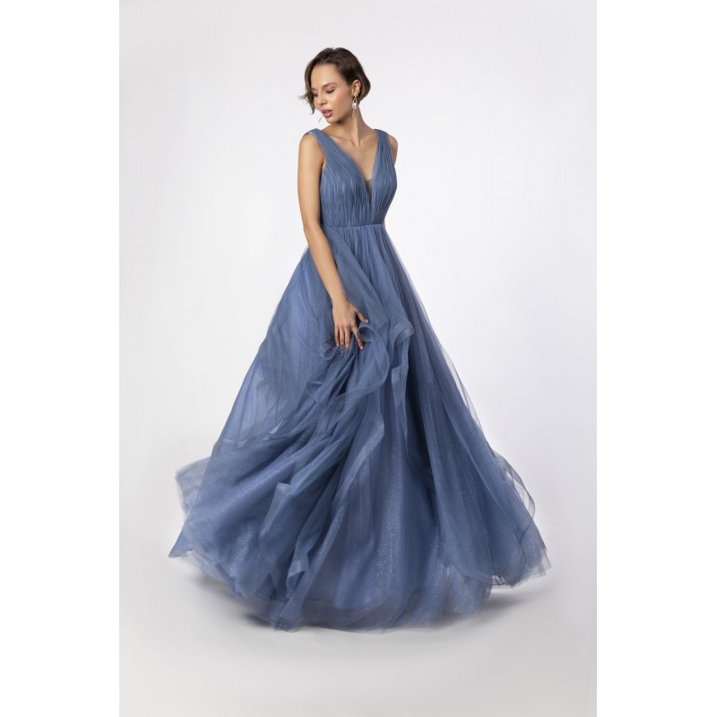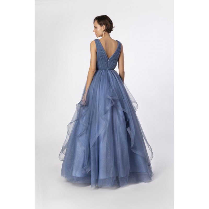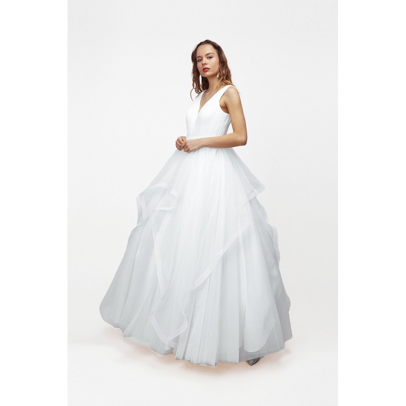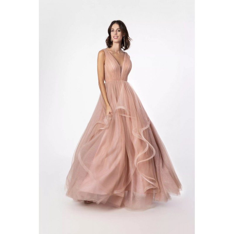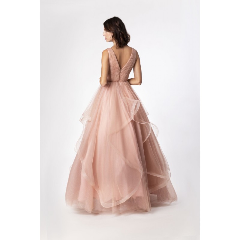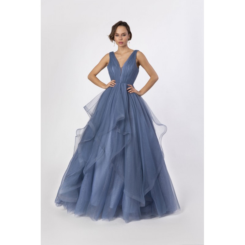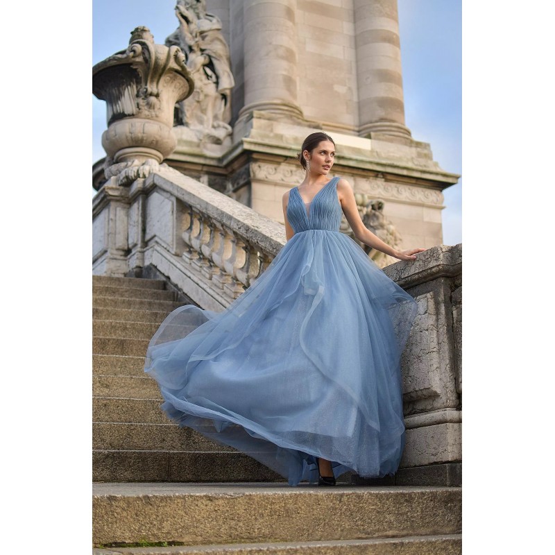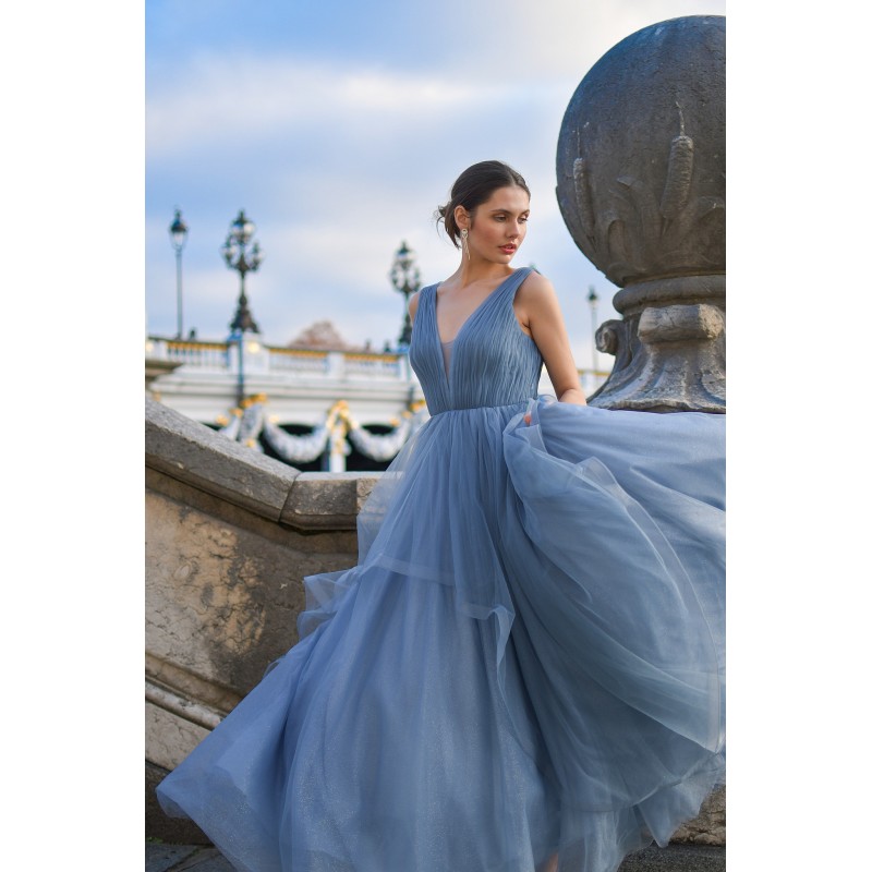 Robe princesse au volume aérien. Le corsage ajusté sublime la silhouette. La jupe évasée crée un mouvement féérique à chaque pas, captant la lumière avec éclat, idéale pour une allure raffinée et majestueuse.