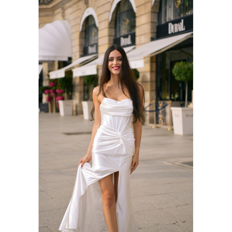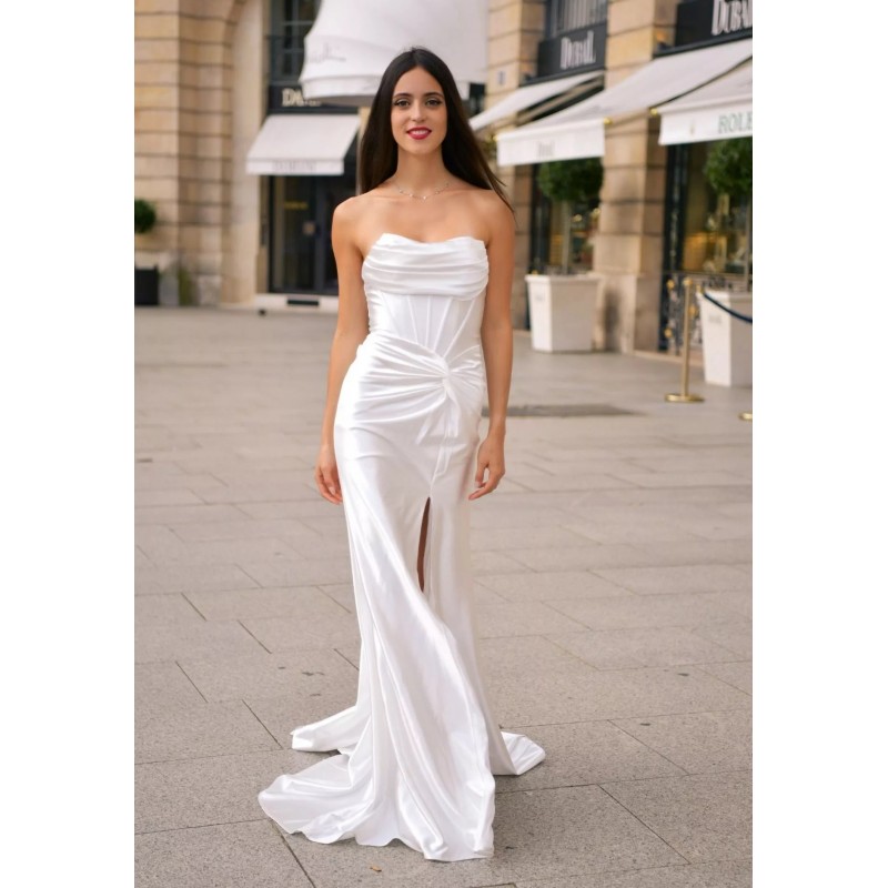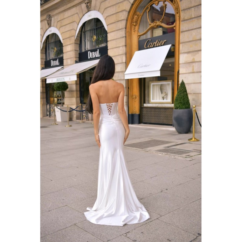 Robe longue en satin, arborant une encolure bustier qui sublime les épaules et le décolleté. La silhouette est soulignée par un drapé délicat à la taille, offrant une allure sculptée et élégante. Un laçage discret au dos apporte une touche de sensualité tout en ajustant parfaitement la tenue. La fente haute sur le côté dévoile subtilement la jambe, ajoutant du mouvement à chaque pas. Le tissu doux et lumineux capte la lumière avec raffinement, pour une apparence gracieuse et moderne
