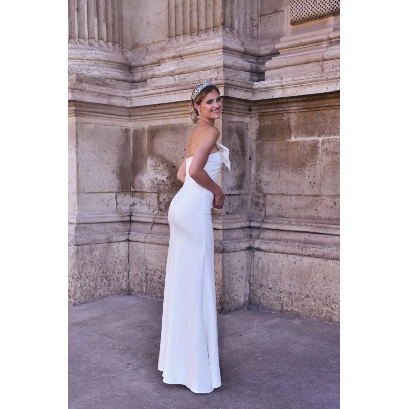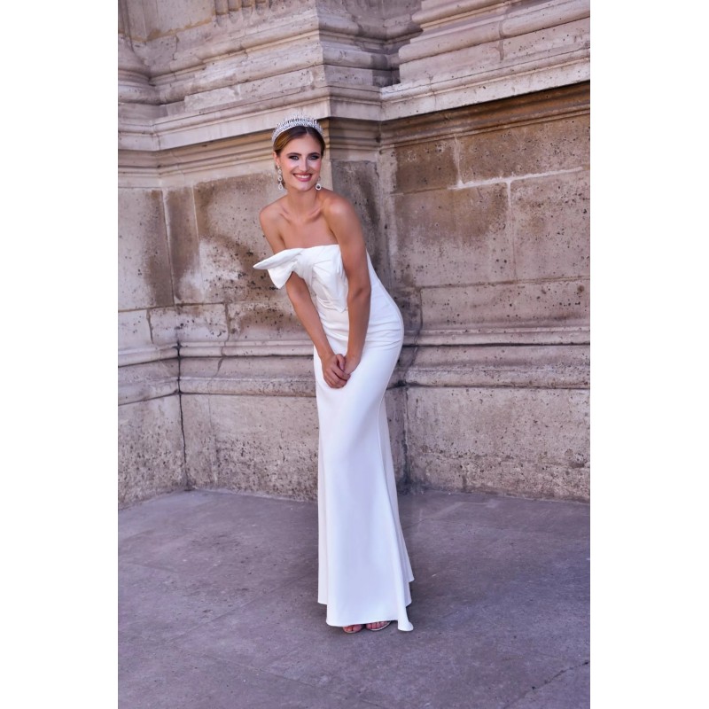 Robe longue en tissu fluide, ornée d’un spectaculaire nœud architectural sur le buste qui attire immédiatement le regard. La coupe bustier souligne les épaules et affine la silhouette. La robe est ajustée au corps jusqu’aux hanches, puis s’évase légèrement en bas pour une allure élégante et raffinée. Un modèle minimaliste mais très couture.