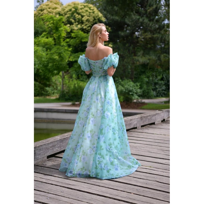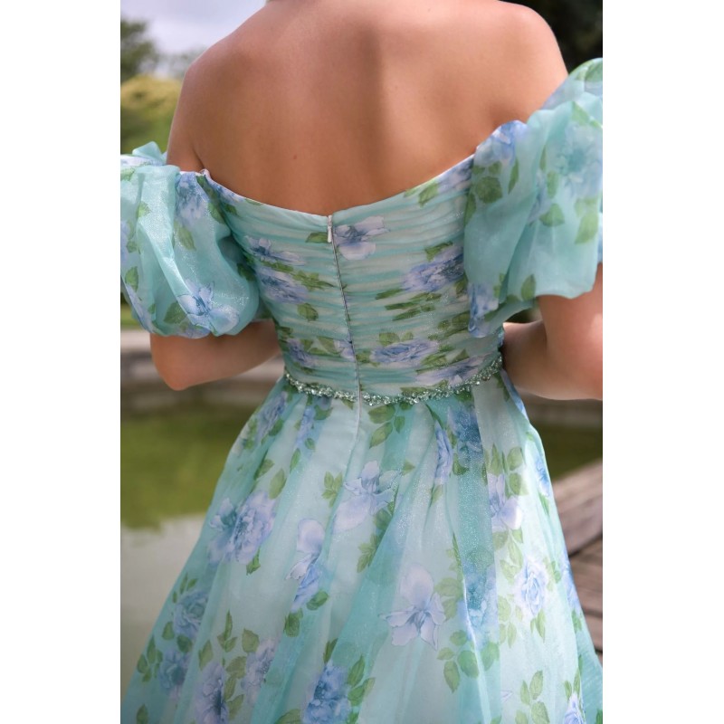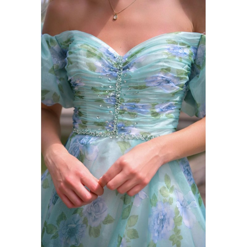 Robe longue à imprimé floral dans des tons doux de vert et de bleu, sublimée par un travail artisanal délicat. Son décolleté en cœur drapé met en valeur le buste avec élégance, tandis que les manches bouffantes ajoutent une touche romantique. La taille ajustée, ornée de broderies et de perles cousues à la main, affine la silhouette avant de s’ouvrir sur une jupe vaporeuse et fluide. Son tissu léger capte la lumière pour un effet enchanteur, parfait pour une occasion élégante. Cette robe incarne la délicatesse et la féminité avec un charme intemporel.
