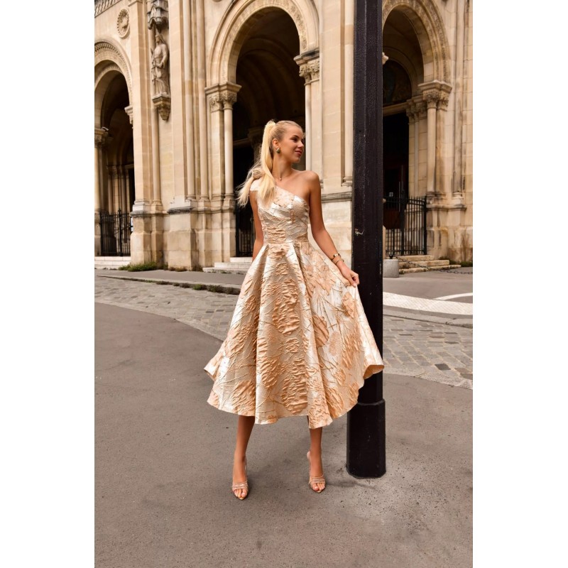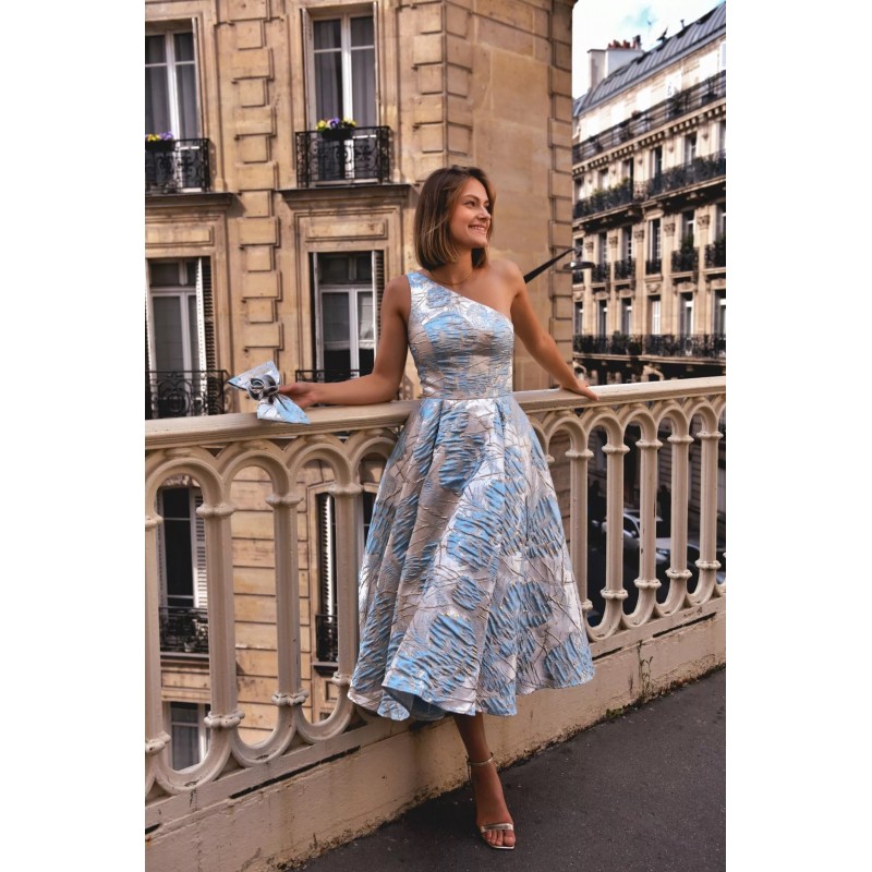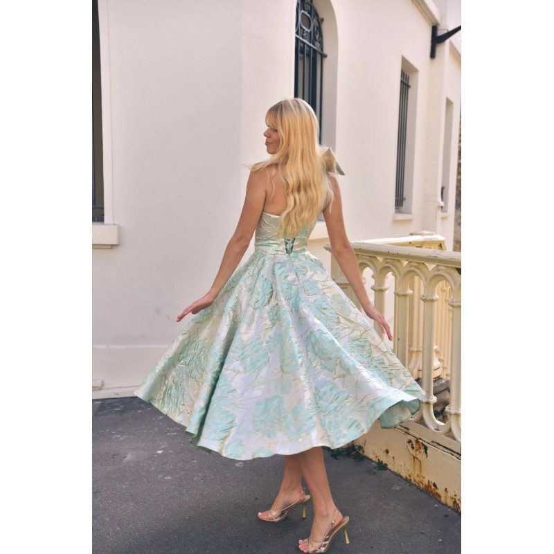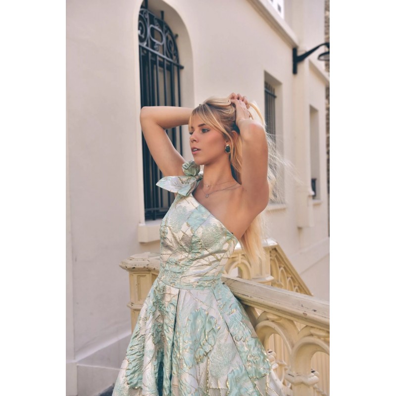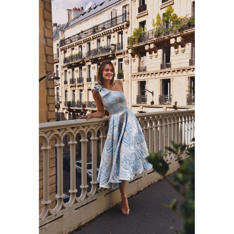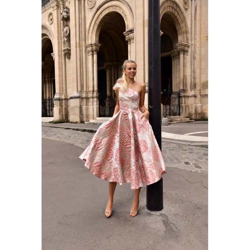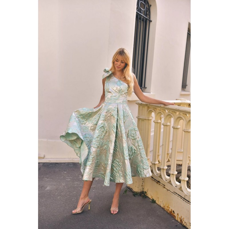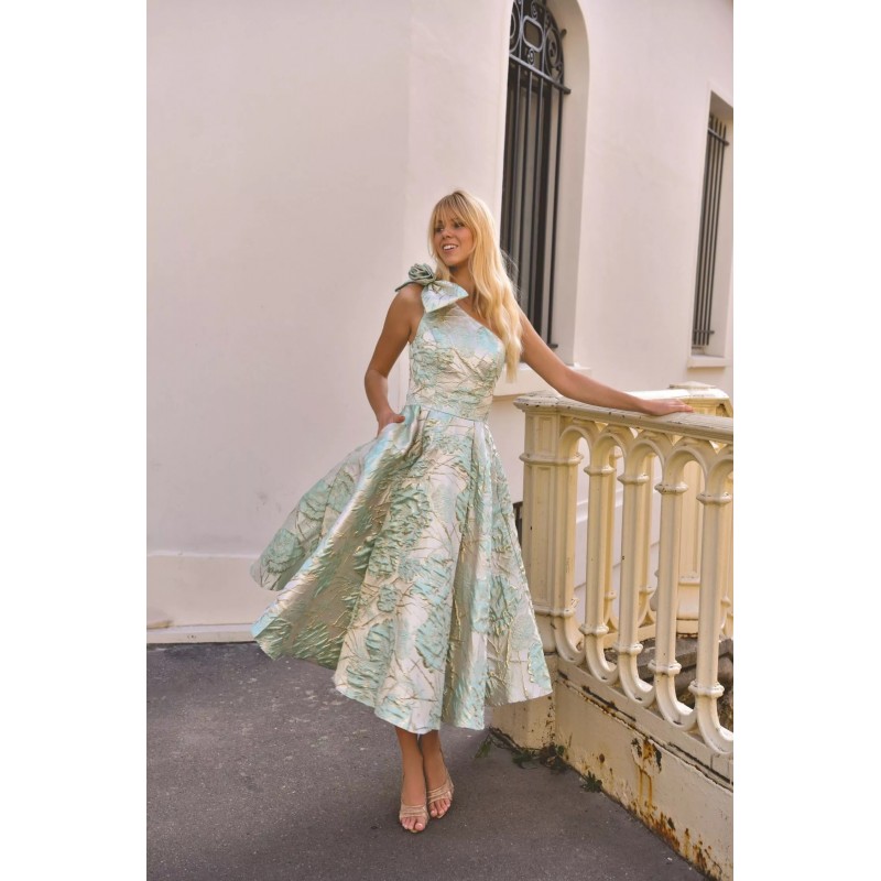 Robe midi en tissu jacquard structuré, avec une coupe asymétrique à une seule épaule ornée d’un nœud volumineux, qui met délicatement en valeur le buste. La silhouette est ajustée au niveau du corsage avec une taille marquée, tandis que la jupe ample et plissée offre un magnifique volume pour une allure aérienne et raffinée. Deux poches discrètes ajoutent une touche pratique sans compromettre l’élégance. Le tissu à motifs floraux brodés capte subtilement la lumière, offrant un style chic et sophistiqué