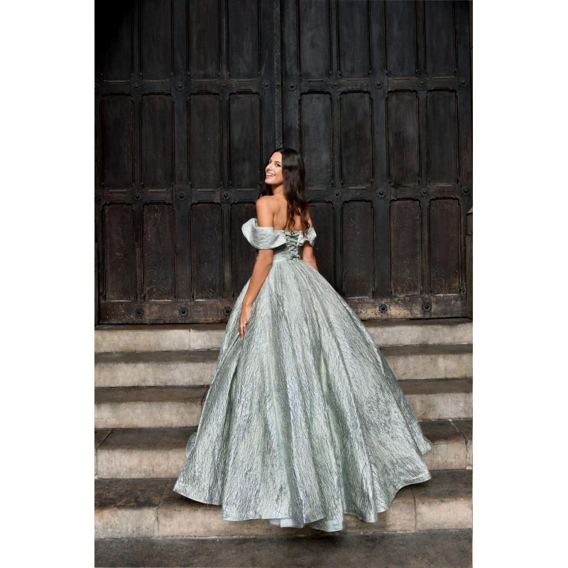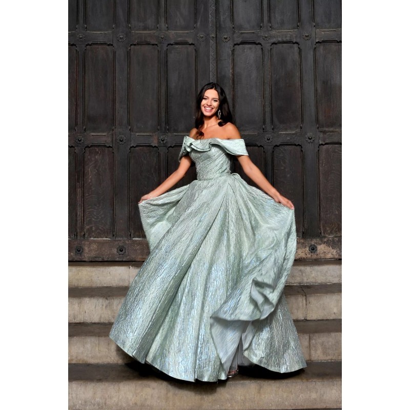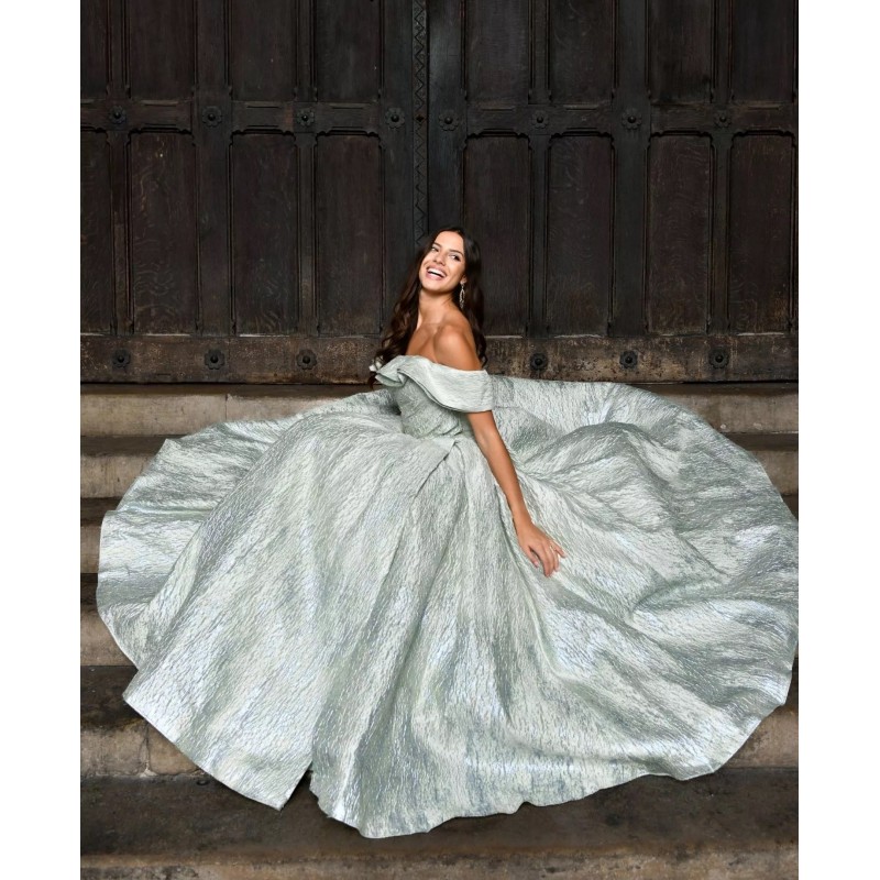 Robe longue en tissu métallisé vert tilleul, avec un corsage drapé et un décolleté bardot qui sublime les épaules avec élégance. La silhouette est ajustée au niveau du buste avant de s’épanouir en une jupe volumineuse aux plis majestueux, créant une allure royale.