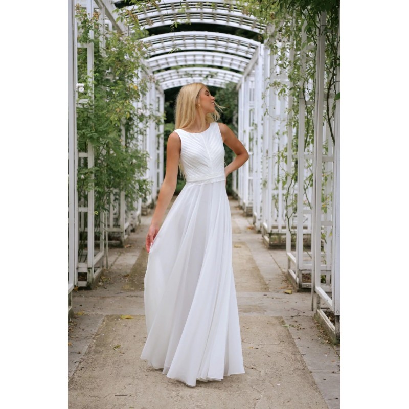 La robe blanche MANILLE s'impose par son classicisme et son élégance. le dos en V font de la robe sans manche MANILLE une pièce de mode des plus chics. La taille resserrée par une bande dentelle dessine la coupe de la robe avec raffinement .
