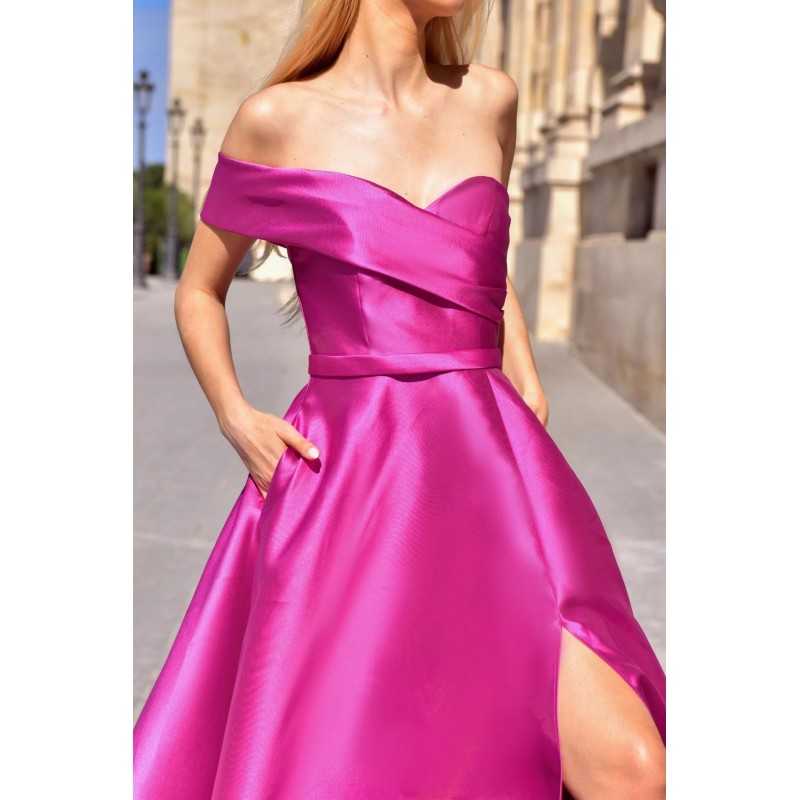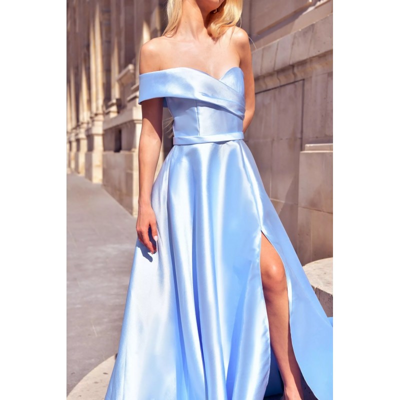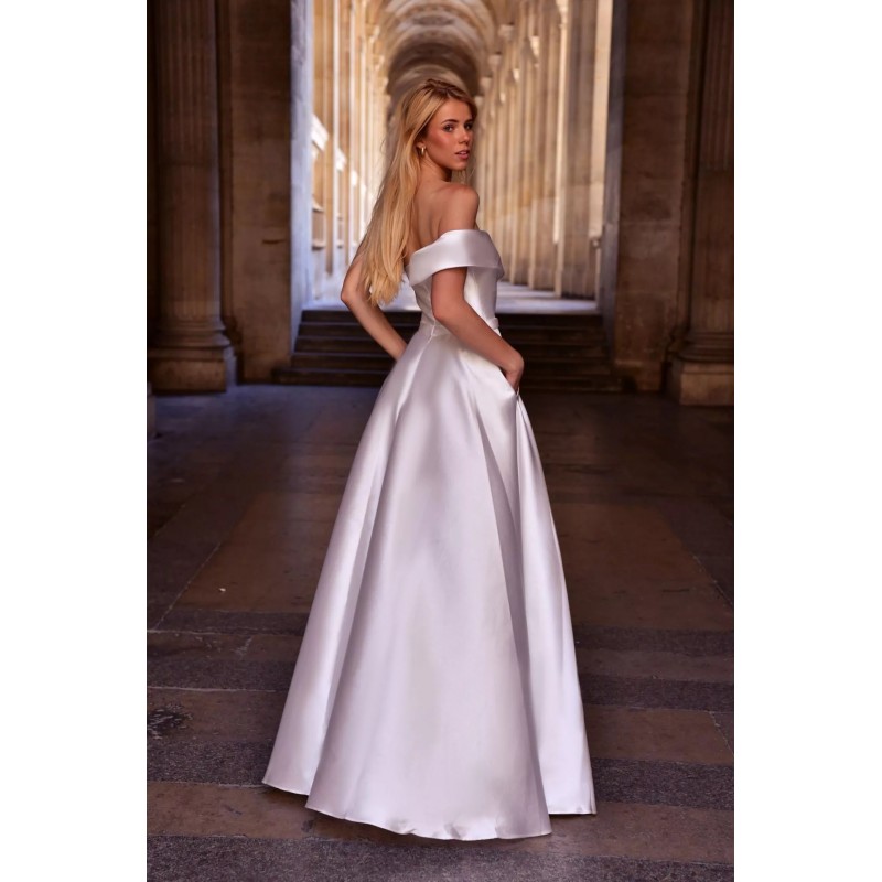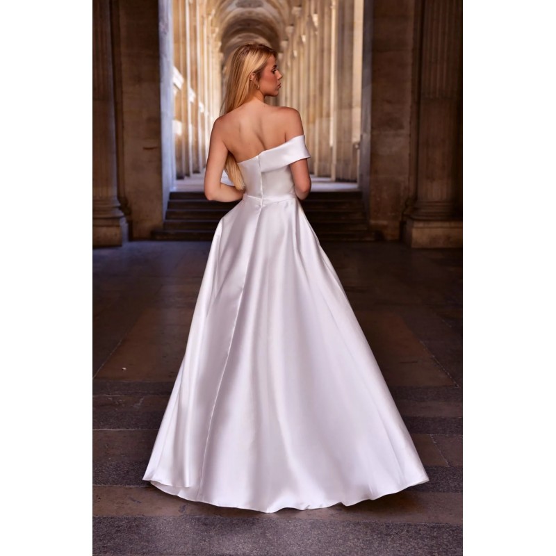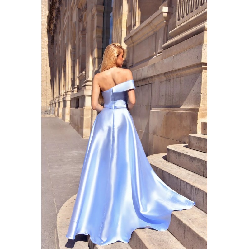 Robe longue en tissu satin, avec un décolleté asymétrique tombant délicatement sur les épaules, sublimant le port de tête.