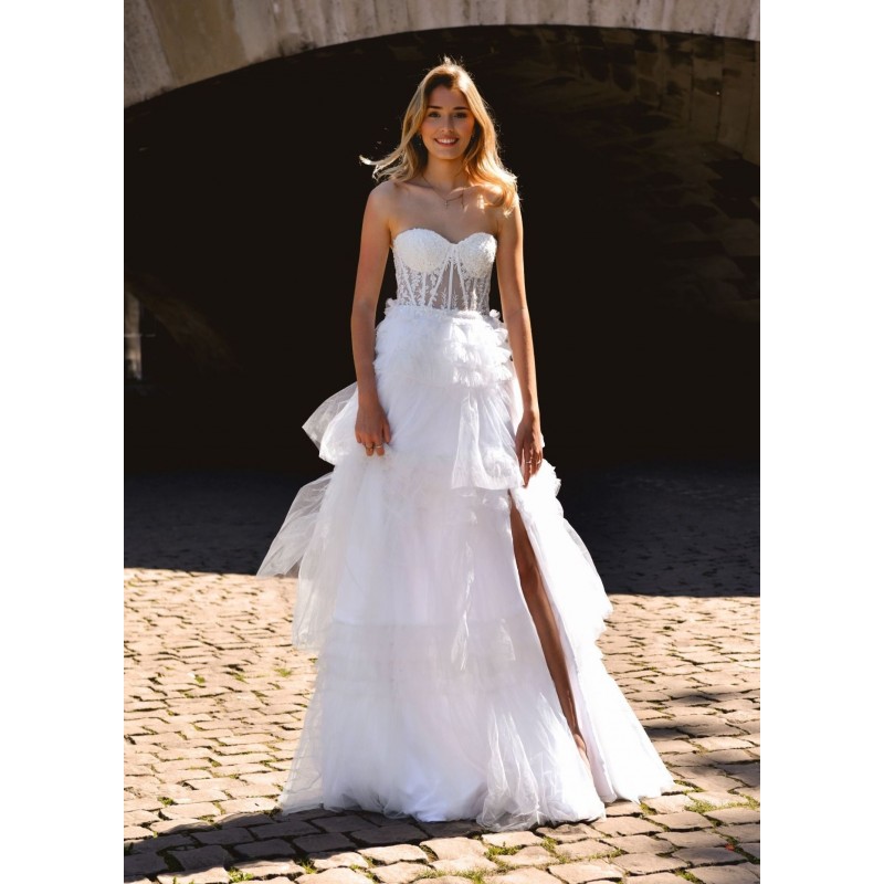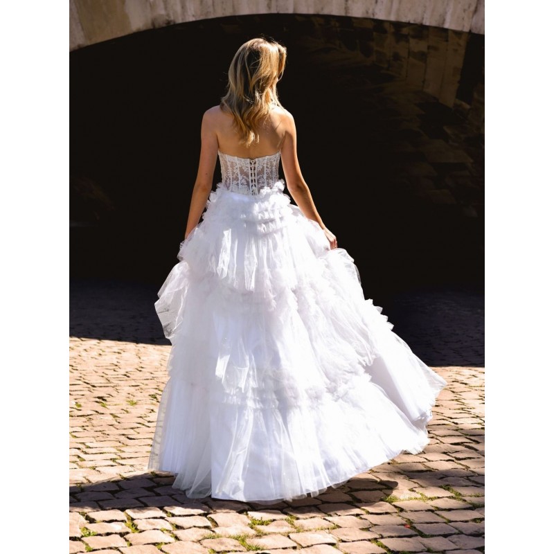 Robe longue en tulle et dentelle, avec un bustier corseté transparent et structuré qui met en valeur le buste grâce à des broderies florales raffinées. La silhouette est sublimée par une taille marquée et une superposition de volants en tulle, apportant un volume aérien et majestueux. Une fente haute dévoile subtilement la jambe, ajoutant une note glamour à l’allure romantique. Le laçage au dos renforce l’effet ajusté du corset, tandis que le tissu vaporeux capte délicatement la lumière, offrant une allure féérique et gracieuse
