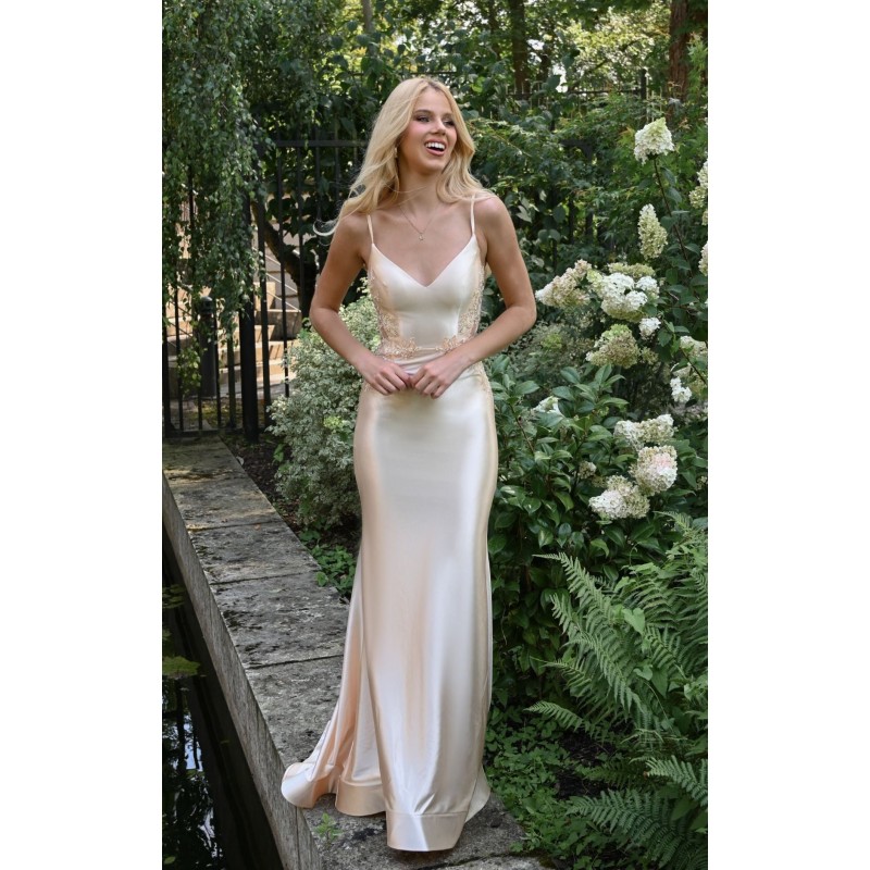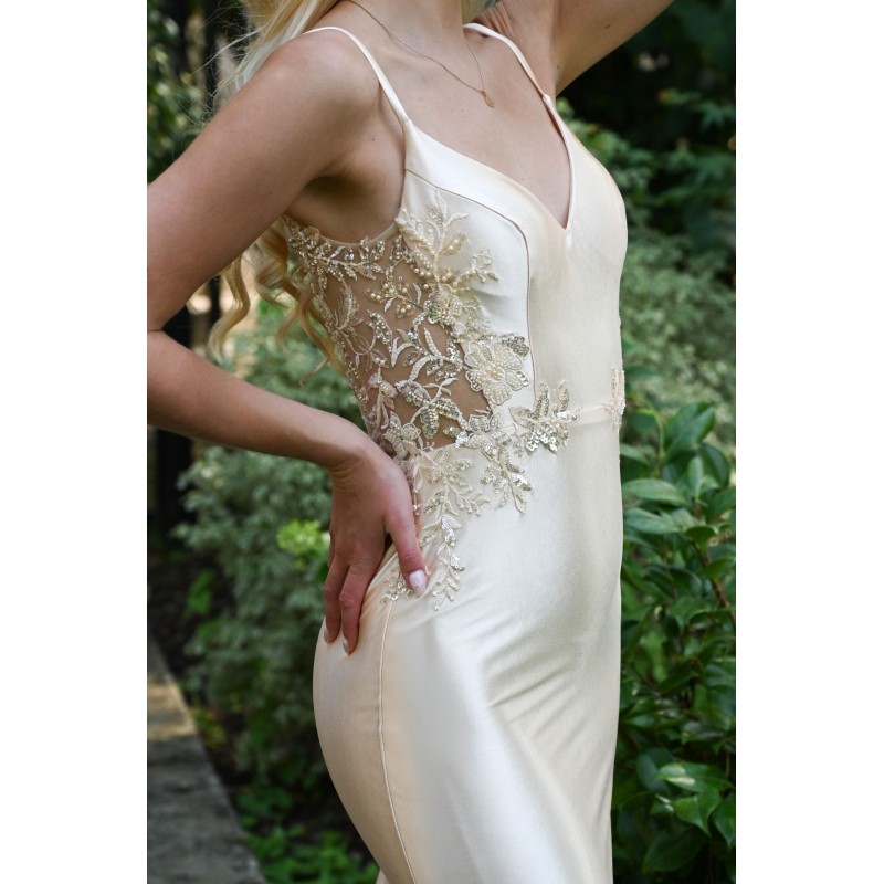 Robe longue en tissu satiné et fluide, cette pièce séduit par sa coupe sirène qui épouse la silhouette avec élégance. le corsage structuré orné de broderies délicates et de sequins sublime le buste avec élégance, le magnifique décolleté au dos crée un effet raffiné. Le tombé évasé au sol soulignent la grâce naturelle de la démarche. Une création sophistiquée et sensuelle, pensée pour illuminer les grandes occasions avec éclat.