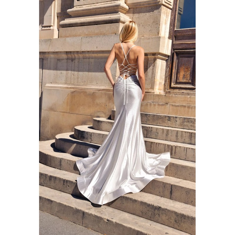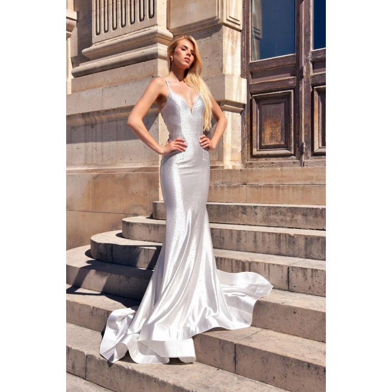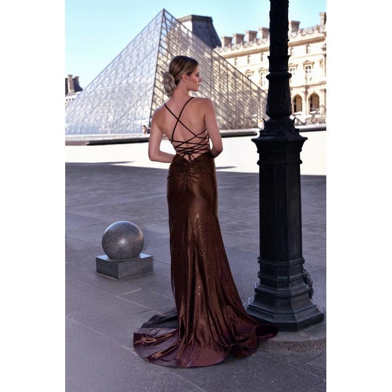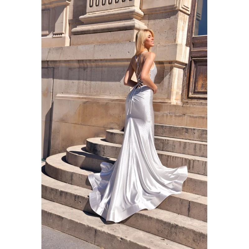 Robe longue en tissu fluide et scintillant, cette pièce séduit par sa coupe sirène qui épouse la silhouette avec élégance. Le bustier ajusté présente un profond décolleté en V et des bretelles fines croisées dans le dos, créant un effet graphique audacieux et raffiné. Le tissu orné de strass capte la lumière à chaque mouvement, accentuant l’effet glamour de la robe. Le drapé au niveau des hanches et le tombé évasé au sol soulignent la grâce naturelle de la démarche. Une création sophistiquée et sensuelle, pensée pour illuminer les grandes occasions avec éclat.