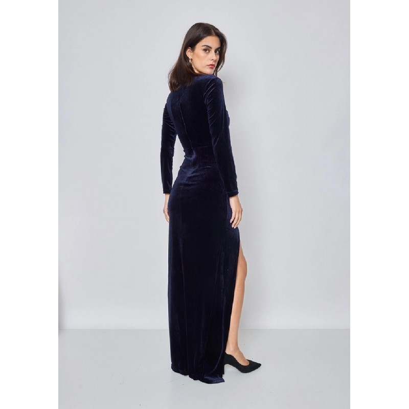 Robe de soirée manches longues en panne de velours, une belle matière à l'apparence réfléchissante, une fente haute sur le devant apporte une note sensuelle et dévoile élégamment la jambe, la coupe en cœur met en valeur le décolleté