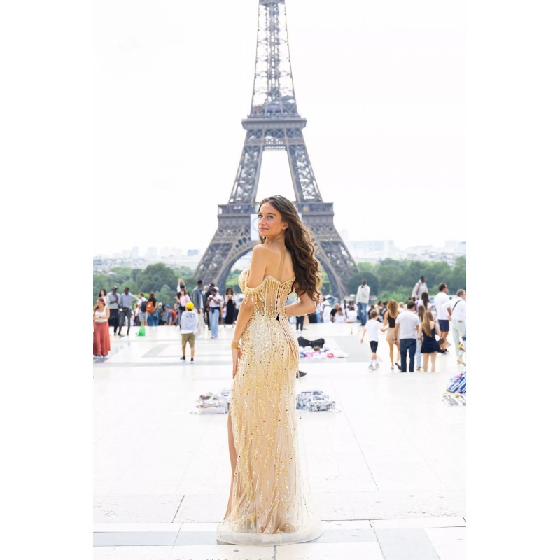 Robe longue à épaules dénudées, entièrement brodée de sequins et perles ton sur ton, offrant une brillance saisissante sous la lumière. Le corset structuré et semi-transparent met en valeur le buste tout en apportant une touche de modernité. La silhouette est parfaitement ajustée, soulignant les courbes avec élégance, tandis qu’une fente haute sur le devant dévoile subtilement la jambe pour un effet glamour. Le laçage au dos accentue la taille et assure un maintien idéal. Une pièce spectaculaire pensée pour les grandes occasions et les soirées d’exception.