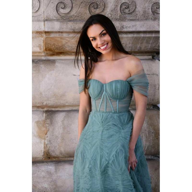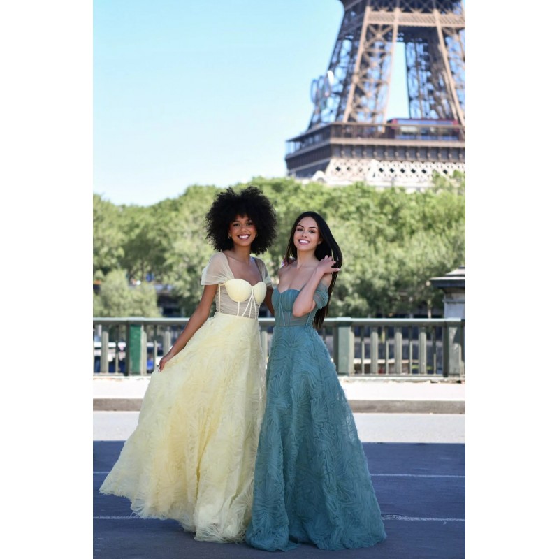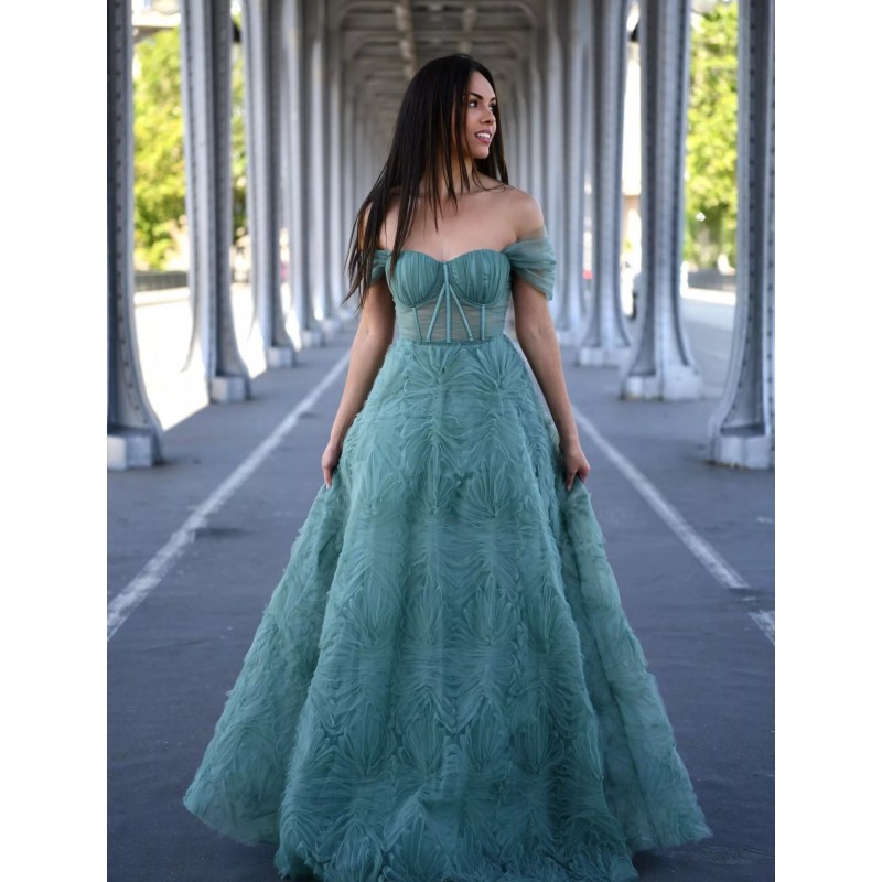 Cette robe de soirée longue au style princesse séduit par son bustier corseté structuré, doté d’un décolleté cœur et de bretelles tombantes qui dégagent joliment les épaules. La taille est marquée pour sublimer la silhouette, puis la jupe s’évase généreusement en une coupe volumineuse au tombé spectaculaire. Son tissu texturé apporte du relief et un effet couture, parfait pour un gala, une cérémonie ou une entrée remarquée lors d’un événement prestigieux.
