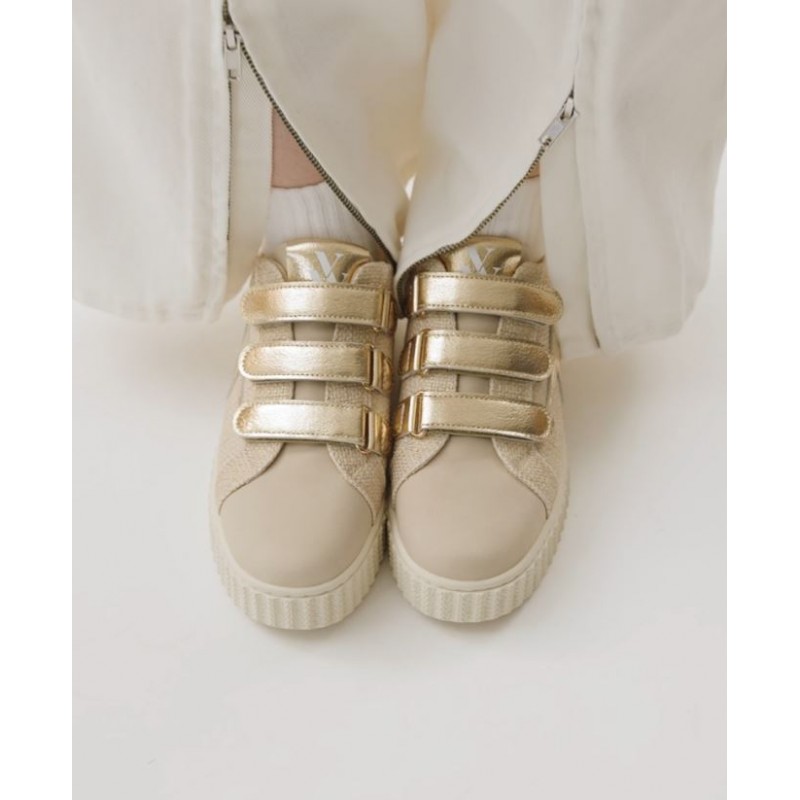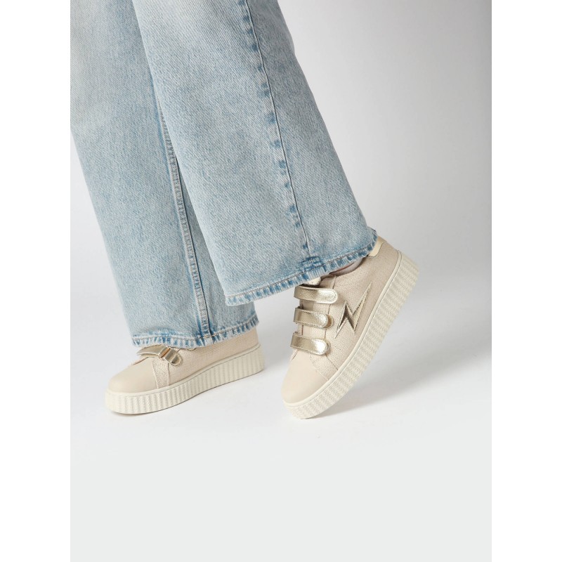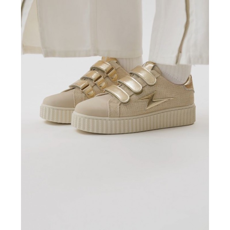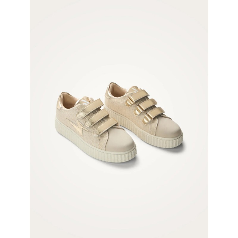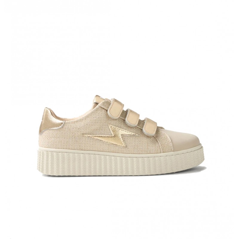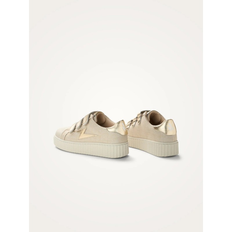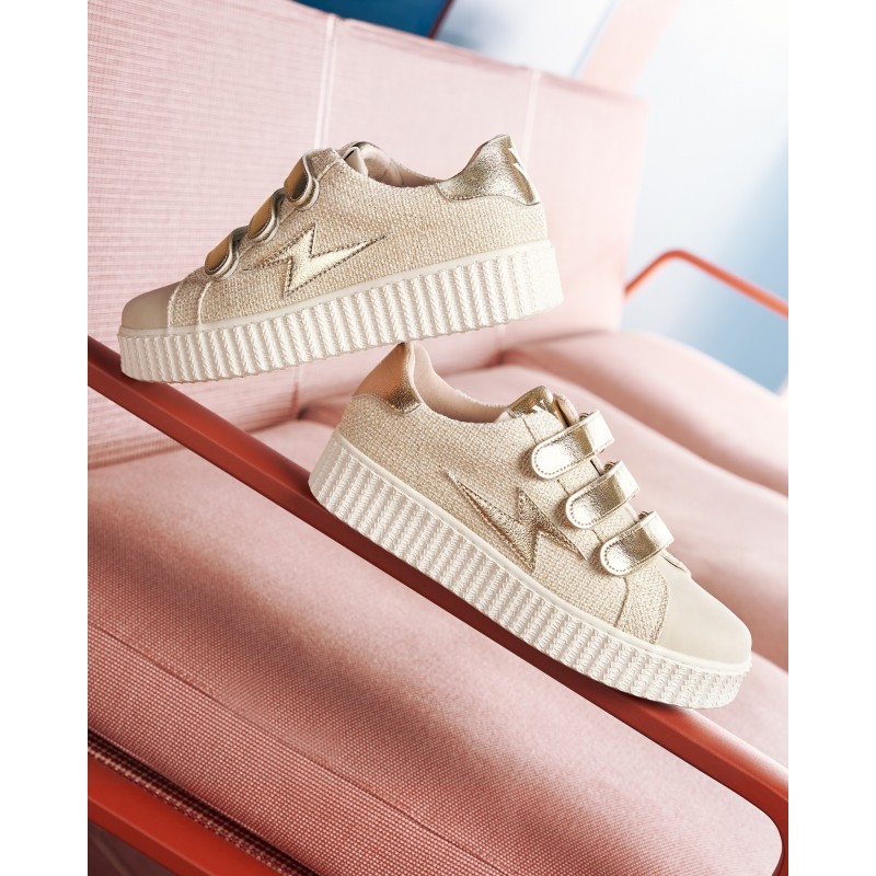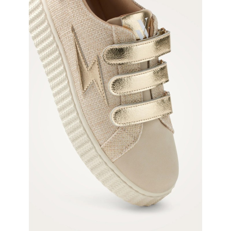 - Baskets en toile nattée beige à fils dorés